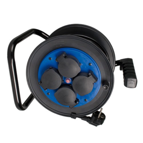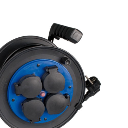 Enrollacable con 4 bases con tapa 2P+T, 16A 230V~. 50 m de cable H05VV-F 3G1,5 mm². MÁX extendido/enrollado 3500/1200W a 230V~ . Con limitador de potencia. IP54 Lee mas