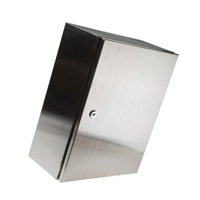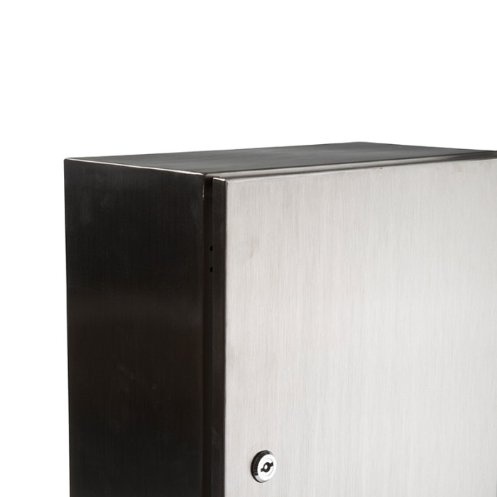 Amplio tablero eléctrico adosado de acero inoxidable (1000x800x300mm), con placa frontal de protección IP66 y NEMA 4X. Ideal para grandes instalaciones industriales y exteriores donde se requiere una alta protección contra la corrosión, polvo y agua. Su tamaño permite una mayor capacidad de distribución eléctrica.