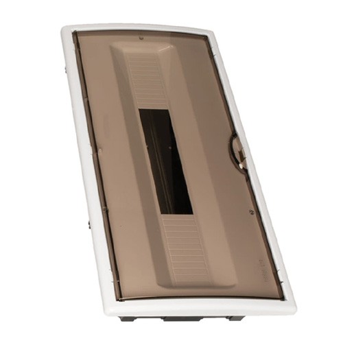 Caja de distribución de empotrar de 22 elementos.Marco blanco y puerta fumé. Dimensiones para empotrar 450 x 222 x 72 mm. Aplicaciones habituales: Entorno domestico/terciario interior (Interior de vivienda, oficinas, comercios, etc..) Lee mas