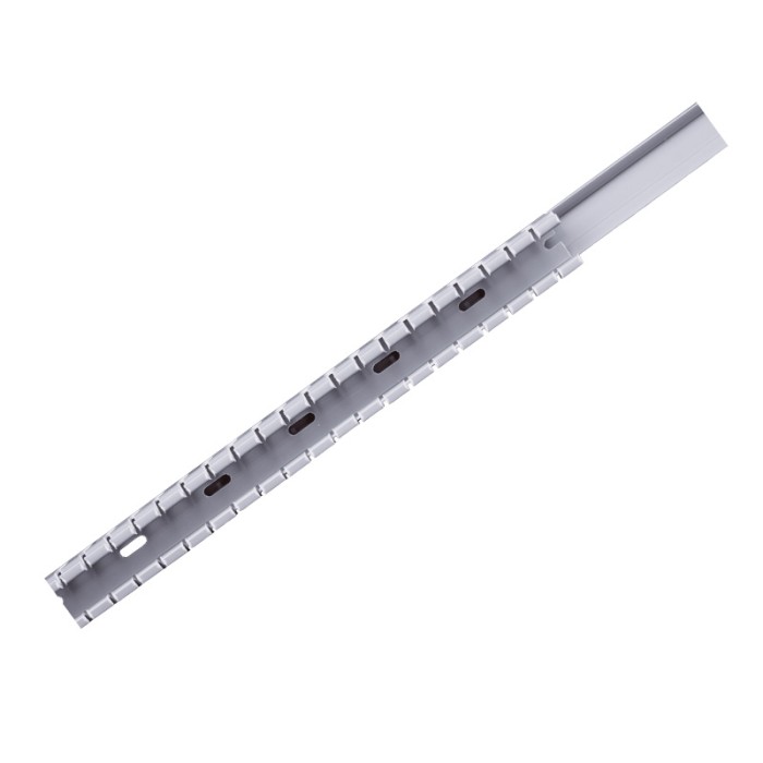 Consta de cubierta y fondo, presenta orificios paralelos en ambas paredes laterales para facilitar el corte de la aplicación del alambre.
